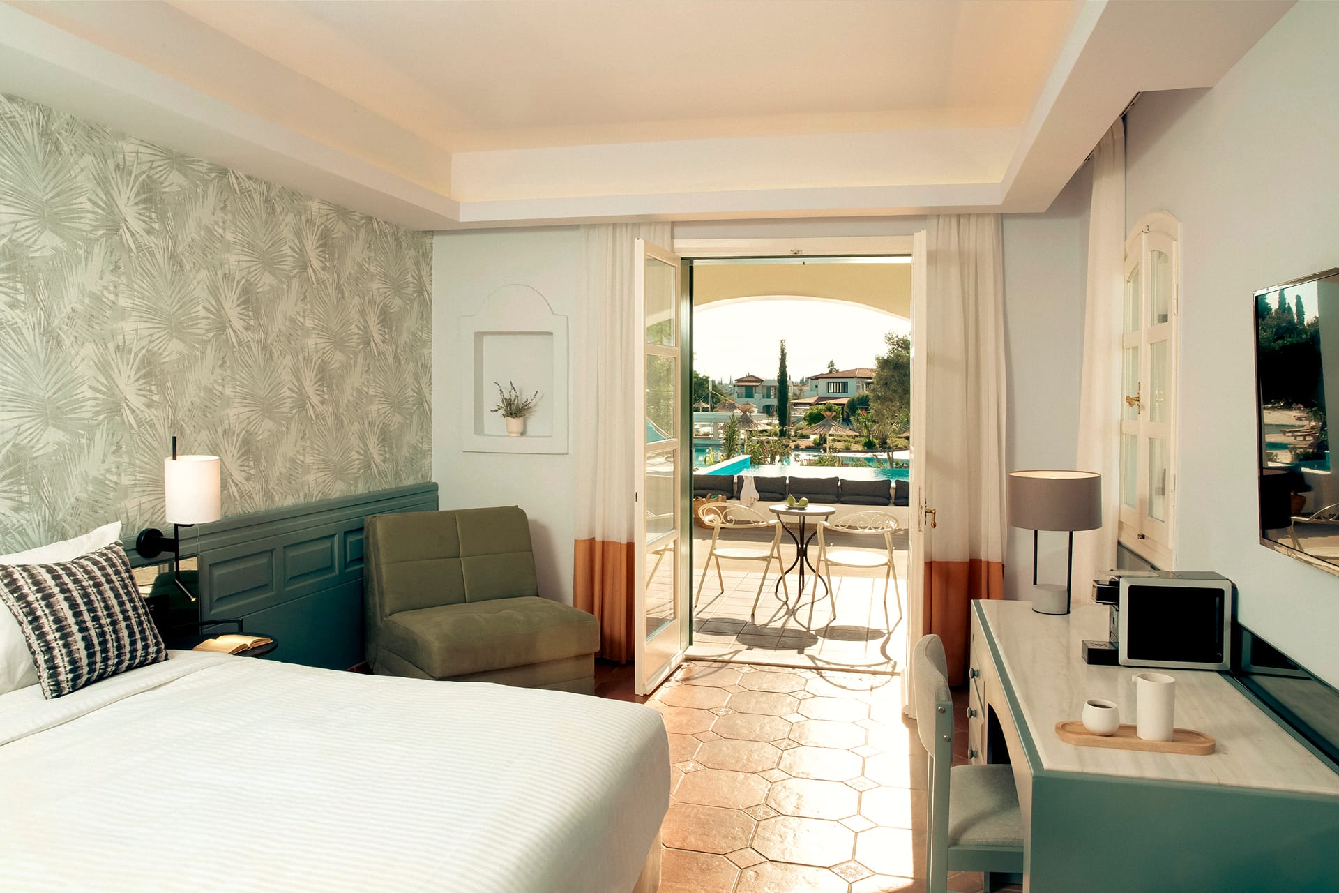 Bright and elegant, this bungalow opens to a private pool with soothing pool views, an inviting escape for peaceful moments under the Mediterranean sun.